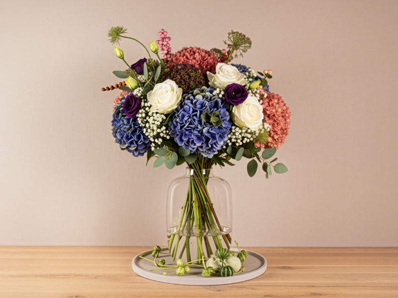 Vol en klassiek boeket met hortensia's, stevige vorm en rijke herfstsfeer.